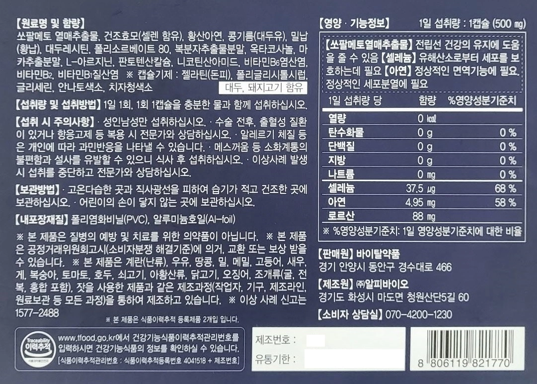 쏘팔메토의 효능과 주의사항에 대해 알아보았습니다. 일상생활에서 쏘팔메토 성분을 따로 섭취하기 어렵기 때문에 쏘팔메토가 들어간 영양제를 섭취하는 것이 일반적입니다. 쏘팔메토 성분 외에도 남성 건강에 좋은 영양소가 들어간 영양제가 면역력을 높여주고 영양제로서도 좋기 때문에 인기가 더 많습니다. 사실 저는 단일 성분으로 섭취하기보다는 다양한 성분이 한곳에 들어 있어서 남성 건강을 증진시키고 남성 건강을 종합적으로 관리할 수 있다면 좋겠다는 생각에 구매하게 되었습니다.