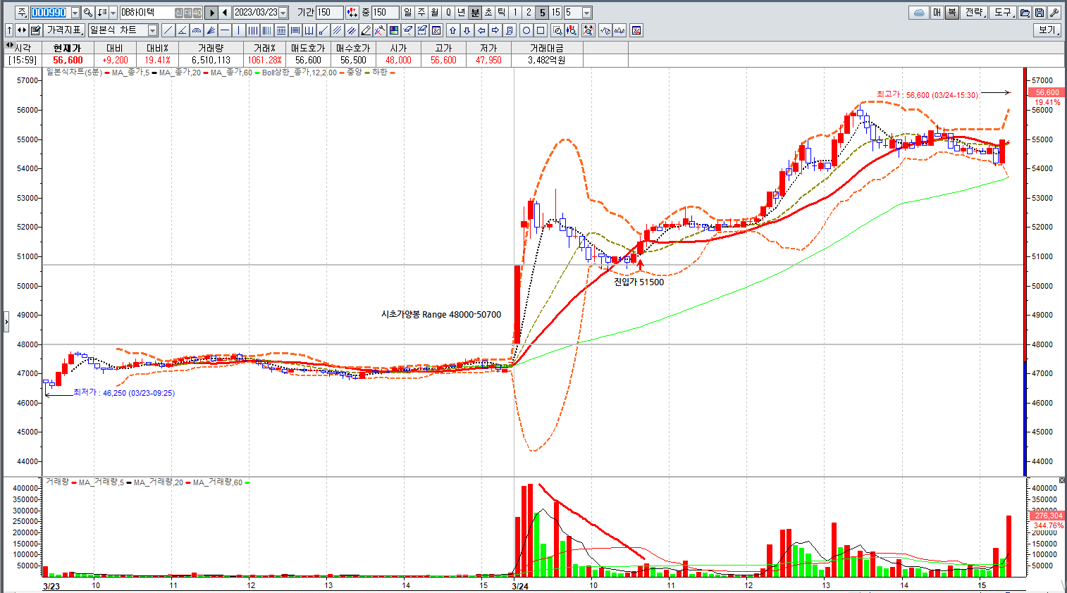 1호 양봉장의 시작가는 4만8000원~5만700원이다. 이 가격대는 오늘날 표준입니다. 그리고 이 가격대에서 거래량이 가장 많았기 때문에 이 가격, 특히 50,700원이 폭락할 때 1) 48,000원의 시세가 지지를 받는지 확인하거나 2) 본 기사 당일 거래를 취소한다.