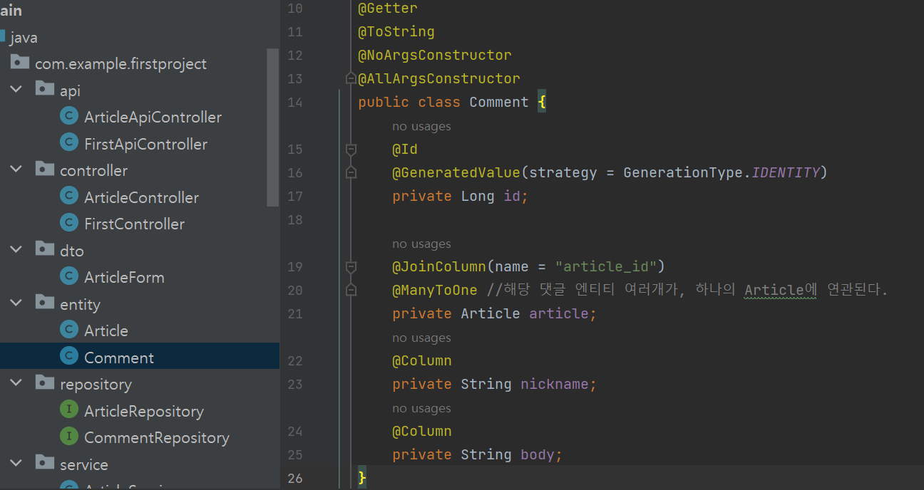먼저 댓글 엔터티를 만들었습니다.