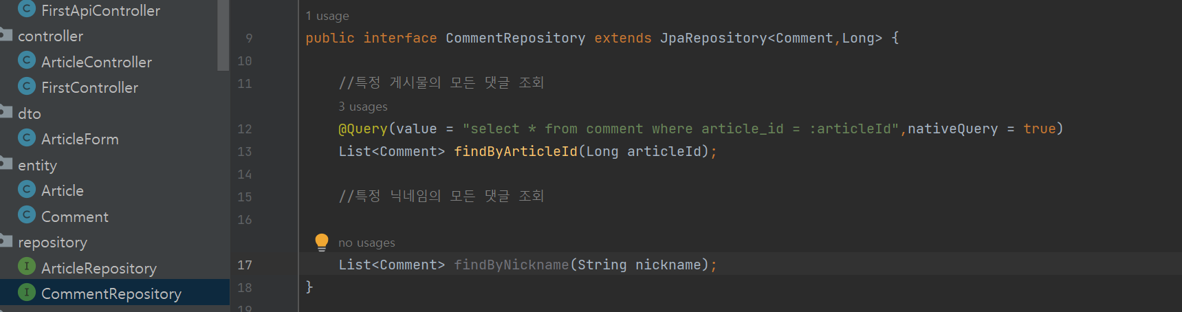 1. @Query 댓글 달기